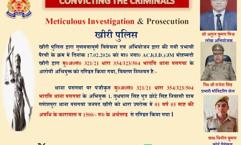 मामले की सुनवाई के बाद माननीय न्यायालय ACJ(J.D.)/JM मोहम्मदी, खीरी ने दिनांक 17 फरवरी 2026 को आरोपी बुधपाल को 1 वर्ष 3 माह का कारावास एवं 1500 रुपये अर्थदंड की सजा सुनाई।