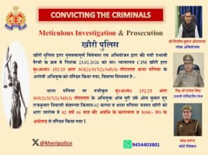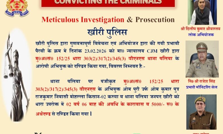माननीय न्यायालय सीजेएम खीरी के न्यायाधीश श्री प्रमोद सिंह यादव द्वारा दिनांक 23.02.2026 को नए आपराधिक कानून बीएनएस के तहत आरोपी ओमपुरी उर्फ ओमकुमार पुत्र राजकुमार, निवासी कस्बा पलिया को दोषी पाते हुए 2 वर्ष 6 माह के साधारण कारावास और 5000 रुपये अर्थदंड की सजा सुनाई गई।