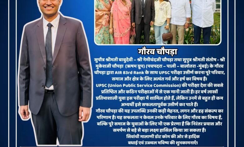 • पचपदरा – पाली – बालोतरा – मुंबई से जुड़े प्रतिष्ठित *चौपड़ा परिवार* के गौरव चौपड़ा ने *UPSC सिविल सेवा परीक्षा 2025* में *AIR 83वीं रैंक* हासिल कर पूरे समाज का सिर ऊँचा किया है!