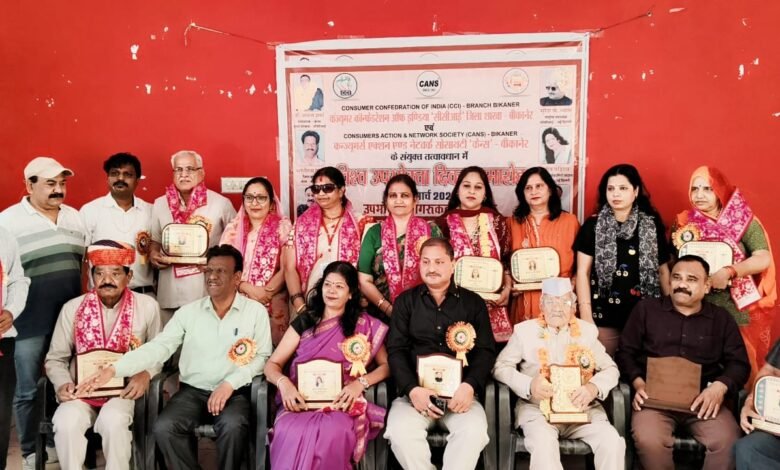 विश्व उपभोक्ता दिवस के अवसर पर कंज्यूमर कॉन्फेडरेशन ऑफ इंडिया (सीसीआई) एवं कंज्यूमर्स एक्शन एंड नेटवर्क सोसाइटी (कैन्स) जिला शाखा बीकानेर के संयुक्त तत्वावधान में भार्गव भवन सभागार में उपभोक्ता जागरूकता कार्यक्रम एवं सम्मान समारोह का आयोजन किया गया। कार्यक्रम में उपभोक्ता अधिकारों, जागरूकता और संगठित होने की आवश्यकता पर जोर दिया गया।