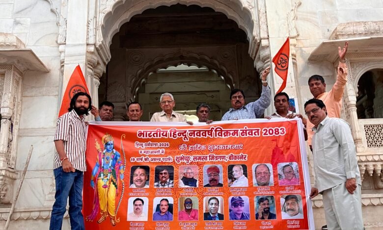 बीकानेर। बीकानेर मित्र एकता सेवा समिति द्वारा शहर में लगायें जाने वाले विक्रम संवत हिंदू नववर्ष 2083 के उपलक्ष्य पर 21 बैनर जिसका विमोचन मंगलवार की शाम को राजरतन बिहारी ठाकुर जी मंदिर के प्रांगण में मंदिर के पुजारी श्री कृष्ण मुरारी द्वारा विमोचन किया गया।