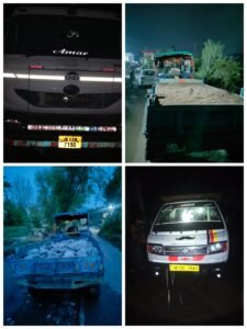 पुलिस द्वारा आज नियमित चेकिंग और पेट्रोलिंग के दौरान चार वाहनों को रोका गया, जिनमें एक डंपर भी शामिल है। जांच में पाया गया कि ये वाहन बिना वैध अनुमति के खनिजों का अवैध खनन और परिवहन कर रहे थे।
