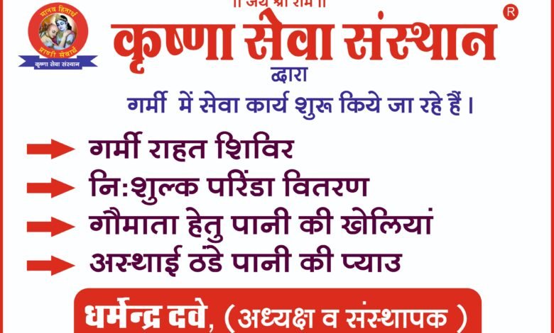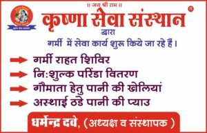 कृष्णा सेवा संस्थान वर्ष भर मौसम के अनुसार अपने सेवा कार्य करती है इसी क्रम में संस्थान द्वारा गर्मी में आमजन को राहत प्रदान करने को लेकर योजनाओं का पोस्टर विमोचन करके प्रारम्भ किया गया।