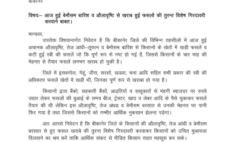 बीकानेर जिले की विभिन्न तहसीलों में अचानक हुई तेज आंधी-तूफान, ओलावृष्टि और बेमौसम बारिश को लेकर जिला कांग्र्रेस कमेटी देहात अध्यक्ष बिशनाराम सियाग ने भेजा कलेक्टर को ज्ञापन। ज्ञापन में लिखा हैं कि खेतों में खड़ी रबी की फसलें बड़े पैमाने पर नष्ट हो गईं। इस आपदा से किसानों की चार माह की मेहनत पूरी तरह बर्बाद हो गई है। जिले में इसबगोल, गेहूं, जीरा, सरसों, खडवा और चना सहित अधिकांश रबी फसलें कटाई के लिए तैयार थीं या खेतों में खड़ी थीं। अचानक आई तेज आंधी और ओलों ने इन फसलों को पूरी तरह नुकसान पहुंचाया हैं।