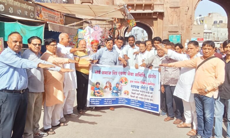 बीकानेर । आने वाले पर्व अक्षय तृतीया एवं बीकानेर स्थापना दिवस पर शहर में होने वाली पतंग बाजी पर बीकानेर शहर के  ह्रदय स्थल कोटगेट के अंदर बुधवार की शाम को चाइनीज मांझे का बहिष्कार करने को लेकर सर्व समाज मित्र एकता सेवा समिति द्वारा संरक्षक सुनील दत्त नागल, बीकानेर कोटगेट व्यापार मंडल अध्यक्ष विजय कोचर के नेतृत्व में काईट एसोसिएशन के पदाधिकारियों , पतंग विक्रेताओं एवं पतंगबाजों को चाइनीज मांझे का बहिष्कार करने की शपथ दिलाई। समिति के वरिष्ठ उपाध्यक्ष एनडी कादरी ने प्रेस विज्ञप्ति में जानकारी देते हुए बताया कि काईट एसोसिएशन अध्यक्ष मोहम्मद असलम कयामखानी ने शपथ लेते हुए कहा कि हमारी संस्था को जो व्यक्ति चाइनीज मांझे बेचने एवं उपयोग करने की जानकारी देता है उसको नक़द 51 सौं रूपए देकर सम्मानित किया जाएगा।उस का नाम गुप्त रखा जायेगा। इस अवसर पर मित्र एकता सेवा समिति वरिष्ठ उपाध्यक्ष सुनील बांठिया, दिलीप गुप्ता, पंडित गायत्री प्रसाद शर्मा, रामकिशन महाराज कोलासर वाले, सैय्यद अख्तर, मेहबूब अली रंगरेज,जयनारायण मारू, शाकिर हुसैन, संत संतोषानंद, टीम नेशन फर्स्ट फाउंडेशन के संस्थापक पंकज कंसल, भवानी आचार्य एवं शिवलाल तेजी आदि के मौजूदगी में यह शपथ ग्रहण कार्यक्रम हुआ।