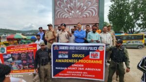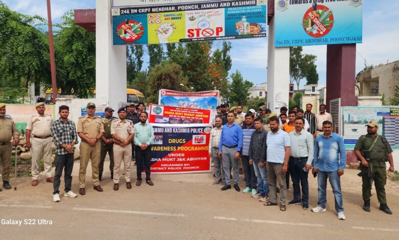 “नशा मुक्त जम्मू-कश्मीर अभियान” के तहत जिला पुलिस पुंछ द्वारा मेंढर में एक विशाल नशा विरोधी जागरूकता रैली का आयोजन किया गया। यह रैली सिविल प्रशासन, सिविल सोसायटी, व्यापार मंडल और विभिन्न शैक्षणिक संस्थानों के सहयोग से आयोजित हुई।